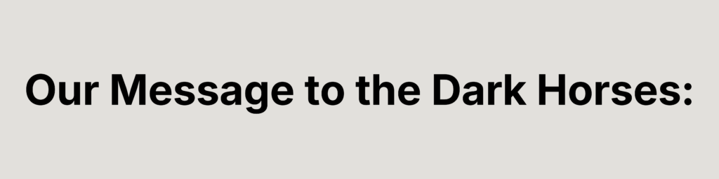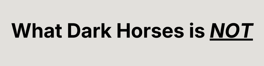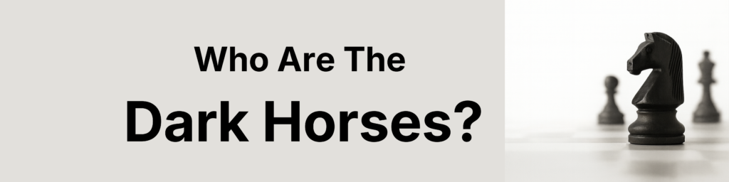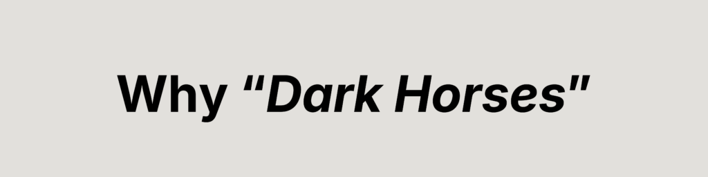 “Dark Horse” typically refers to someone who is underestimated or overlooked. They often achieve unexpected success, often against the odds. They have hidden strengths, talent or potential that have gone unnoticed or unappreciated. For those reasons, almost no one sees them coming.